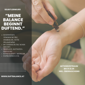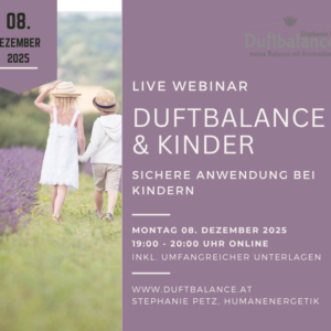 In diesem Webinar dreht sich alles um die Erkältungszeit. Wie du ätherische Öle, fette Pflanzenöle und Hydrolate zusätzlich zur medizinischen Unterstützung anwenden kannst und deinen Körper mit der Kraft der Natur zusätzlich unterstützen kannst. Buchbar/Kaufbar bis zum 29.09.2023 23:59 Uhr